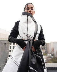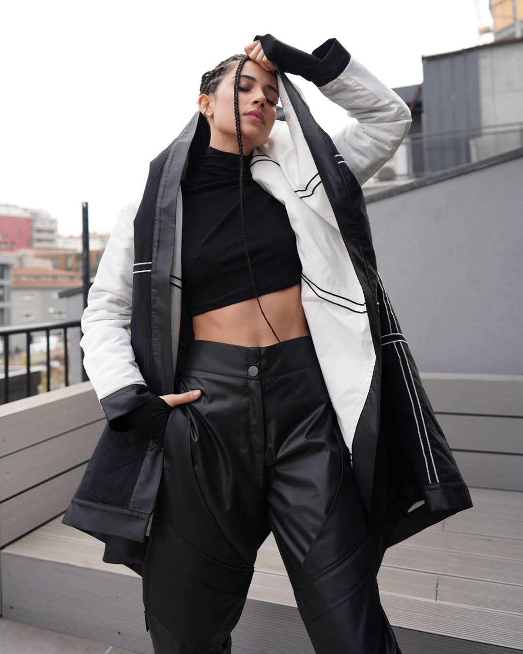 Siyah ve beyaz taftadan yapılmış çift taraflı dış giyim.